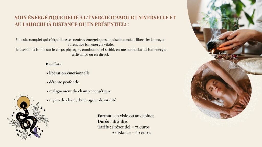 • Les soins énergétiques et lectures akashiques sont aussi disponibles à distance.